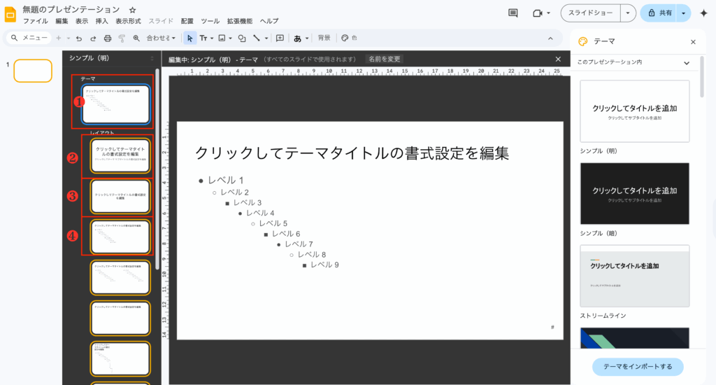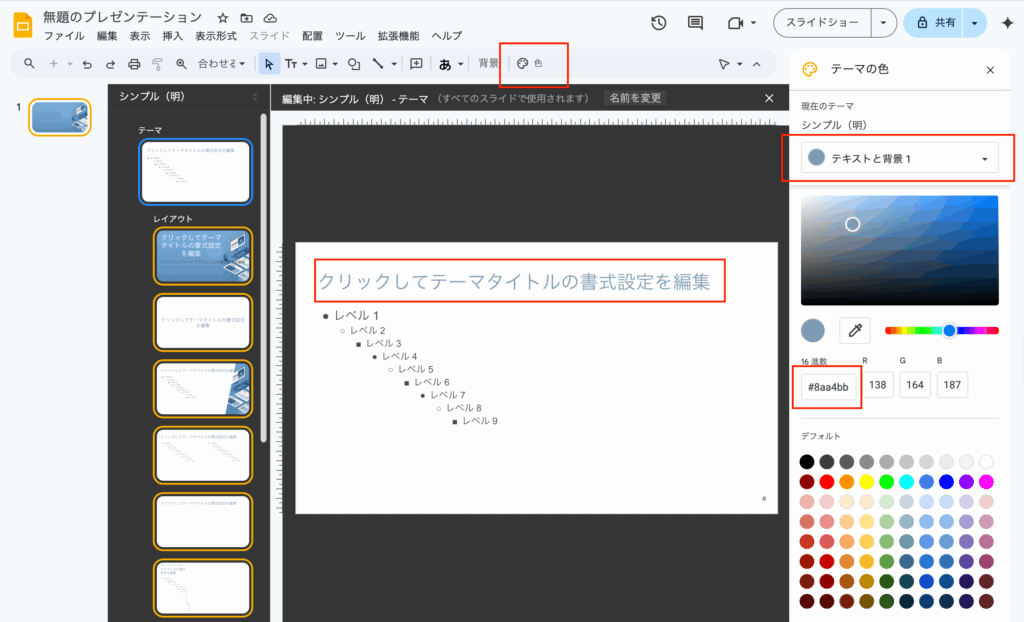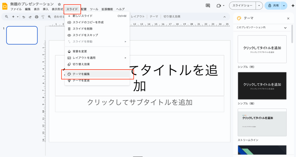 スライド→テーマを編集をクリック