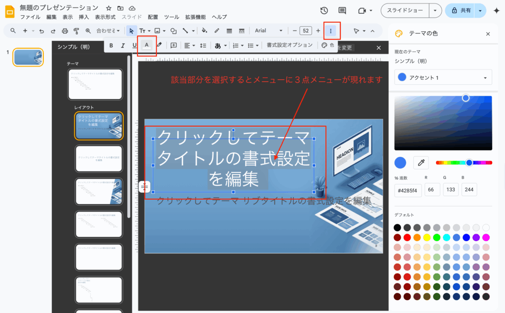 - 表紙など変更したいスライドを開き、該当のテキストエリアを選択すると、上部メニューの右に3点メニューが出ます。